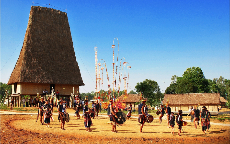 The Central Highlands of Vietnam, covering provinces such as Gia Lai, Dak Lak, and Kon Tum, are home to ethnic groups including the Gia Rai, Ede, Mnong, and Ba Na. The region is best known for its gong culture, recognized by UNESCO as intangible heritage. Gong ensembles play a central role in festivals, rituals, and communal life. Villages often feature tall, thatched communal houses (rong houses), which reflect the strength of collective identity. Storytelling, myths, and epics passed down orally continue to define the cultural richness of the Central Highlands today.